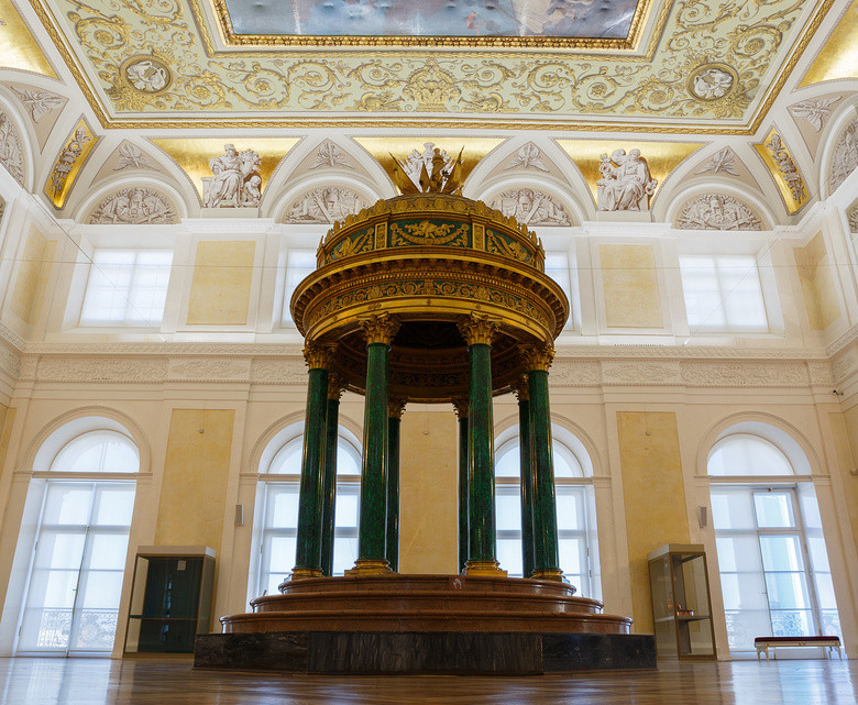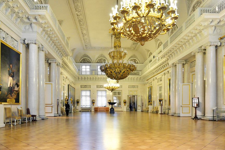 Из Аванзала гости попадали в главный дворцовый зал — Большой. В 1855 году, когда умер Николай I, здесь разместили его портрет, и с тех пор зал стали называть Николаевским. По периметру установлены полуколонны с коринфским ордером — лепным декором в верхней части. Эти полуколонны поддерживают массивный карниз — антаблемент. Не забудьте обратить внимание на потолок: он расписан в технике гризайль, которая имитирует рельеф. В Николаевском зале проходили официальные приемы и балы, а в годы Первой мировой войны монаршая семья размещала здесь тяжелораненых солдат. Тогда в Зимнем дворце открыли хирургический лазарет на тысячу мест, оснащенный лучшим на тот момент оборудованием.
