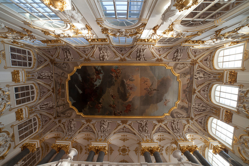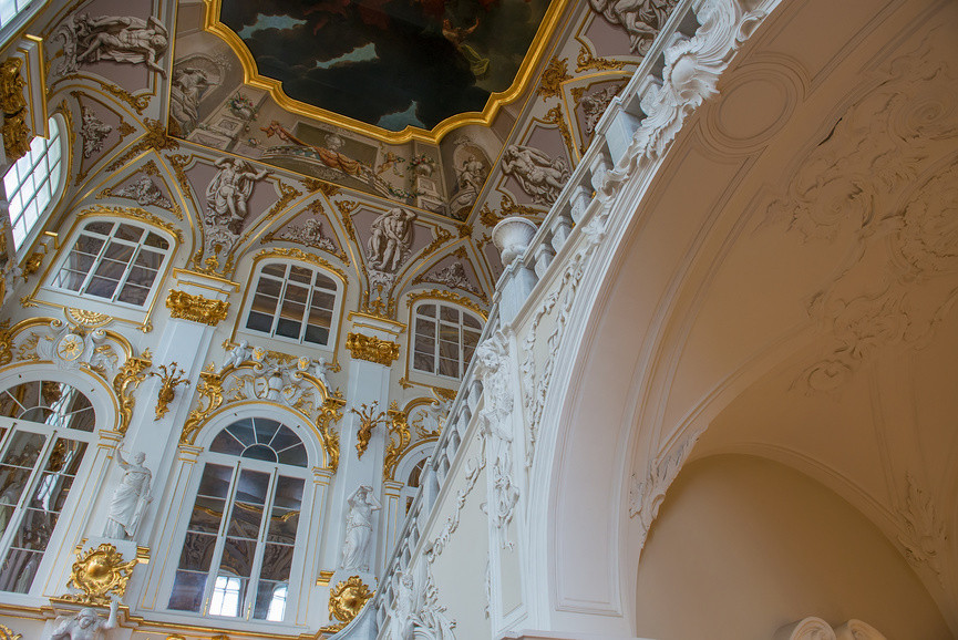 Знакомство с музеем удобно начать с Зимнего дворца — вход находится со стороны Большого двора, куда можно пройти через арку напротив Александровской колонны.