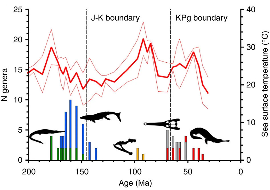 Крокодиломорфы (Crocodylomorpha) на протяжении своей истории несколько раз осваивали морскую среду. В их числе телеозавроиды (Teleosauroidea) и метриоринхоиды (Metriorhynchoidea) из группы талаттозухий, некоторые представители фолидозаврид (Pholidosauridae), дирозаврид (Dyrosauridae) и собственно крокодилов (Crocodylia), а также торакозавры. Метриоринхиды (Metriorhynchidae) лучше всех приспособились к жизни в море: им даже пришлось стать живородящими, так как они не могли выходить на сушу.