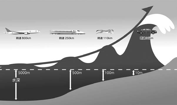 По морским просторам волна цунами мчится со скоростью самолета, за считаные часы удаляясь от центра событий на тысячи километров. Близ пологого берега она вздымается; ее кинетическая энергия превращается в потенциальную энергию воды, вставшей стеной. Ее высота здесь составляет, как правило, несколько метров.