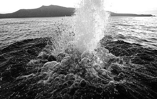 Стены вулкана обвалились. Образовалась котловина – кальдера. В эту пустоту хлынуло море. «Достигнув дна полости, – писал Галанопулос, – вода мгновенно ринулась вспять». Вверх взметнулся столп воды, возникла громадная волна цунами, устремившаяся вдаль, разрушая и затапливая всё на пути.