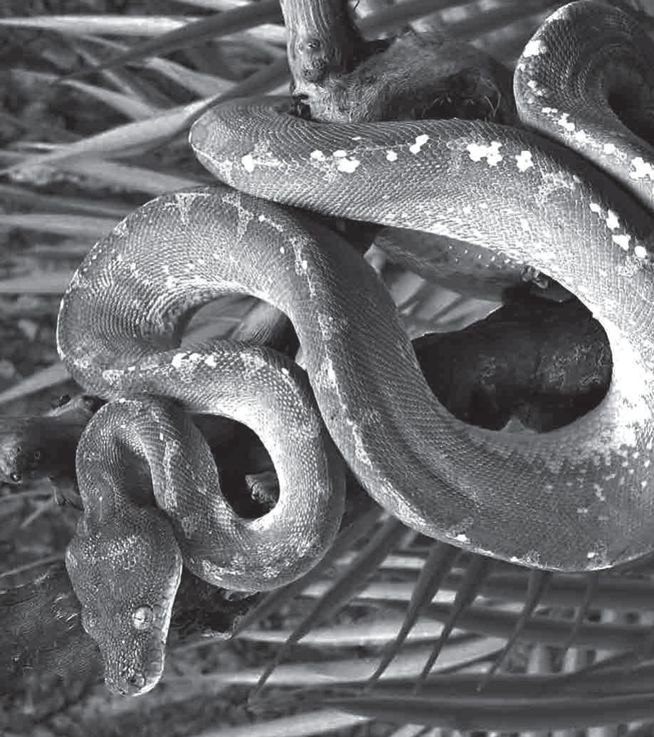 Я пробираюсь по еле видимой тропинке, на которую со всех сторон наступают джунгли, стремясь окончательно задушить ее. Все время смотрю по сторонам, пытаясь сохранить в своей памяти и унести с собой все эти красоты. А также опасаюсь, – как бы с нависающих ветвей кто‑нибудь на меня не прыгнул сверху! Вот тропинку перегораживает толстая ветка, на которой застыл удивительный зеленый цветок. Вглядываюсь в него и с удивлением узнаю древесного зеленого питона, который расположил свои толстые кольца на ветке и поглядывает из их центра по сторонам. Он небольшой, – под два метра, и совершенно неопасный для нас, людей, поэтому я медленно приближаюсь и рассматриваю это чудо животного мира. У него ромбическая треугольная голова, покрытая крупными зелеными чешуями, и огромные глаза, как бы закрытые прозрачными линзами, с вертикальным зрачком: расширяясь, он позволяет змее видеть все в темноте. Особо впечатляюще окончание морды, с выемкой на верхней челюсти, откуда иногда вылетает его раздвоенный язычок. Именно им он нюхает воздух.