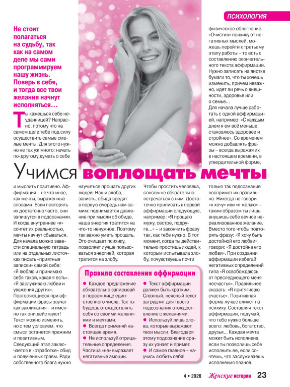 Жизнь так интересна, что захватывает дух! Обсудить самые острые новости, удивиться яркой судьбе, поплакать над трагедией и, порадовавшись, слегка позавидовать счастливчикам — такие женские желания и миссия журнала «Женские истории. Откровенные, душевные, правдивые»!